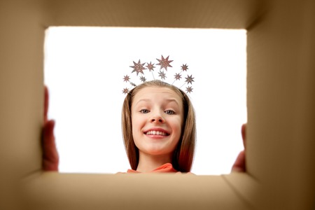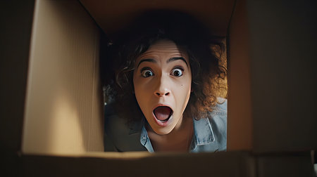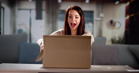 a Surprised young woman unpacking. Opening carton box and looking inside.