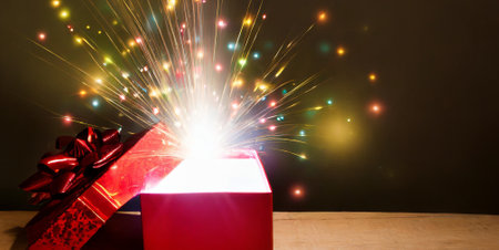 A vibrant red gift box emanates sparkling light and floating particles, set against a dark background, evoking feelings of wonder and surprise.