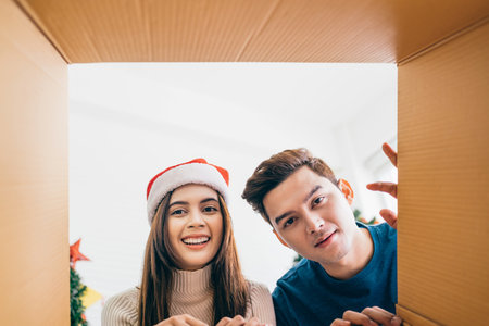 Young Asian couple opening a Christmas present together with a smile, views from inside of the box with a decorated Christmas tree in the background. Boxing day during the Christmas holiday.