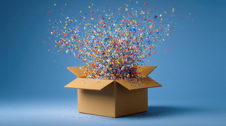An explosion of colorful confetti bursts from an open box, symbolizing celebration and joy. The vibrant blue background enhances the festive mood and energy.