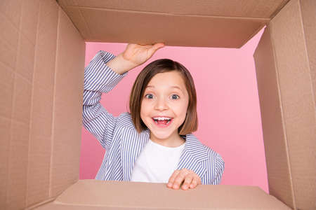Portrait of attractive trendy cheerful girl opening box package gift present surprise isolated over pink pastel color background