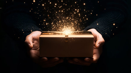 Two hands delicately open a gift box, releasing sparkling lights that create a magical atmosphere perfect for celebrations and joyful moments.