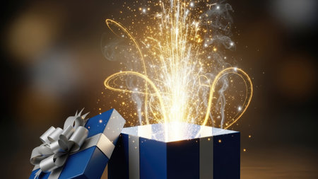 An open gift box emits a burst of light and sparkles, creating a vibrant visual effect. The scene features a mix of colors and textures, suggesting a celebratory occasion. This image could be used for various commercial or editorial purposes, representing joy, surprise, or special events.