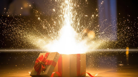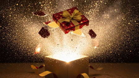 An enchanting red gift box opens to reveal a burst of magical sparks and warm light, creating a captivating atmosphere perfect for celebration themes.