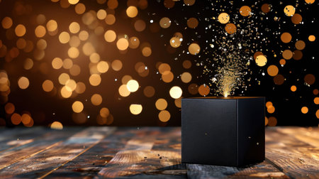 A captivating black box emanates sparkling dust against a warm bokeh backdrop, creating a magical atmosphere perfect for celebrations and surprises.