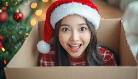 Young woman wearing a santa hat is excited about the gift she found in a box under the christmas tree