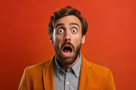 Close-up portrait of a man with a shocked expression against a yellow background. His eyes are wide, and his mouth is open in surprise.