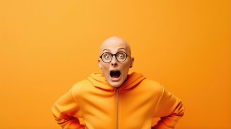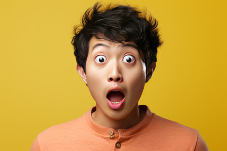 Surprised man portrait. Young guy on a simple yellow background. AI generated