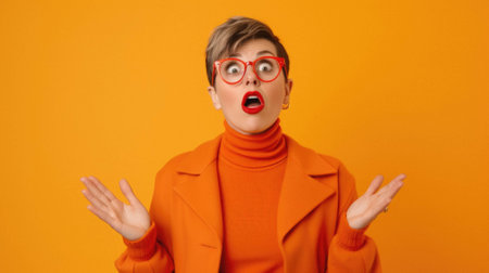 Shocked woman with yellow jacket on orange background.