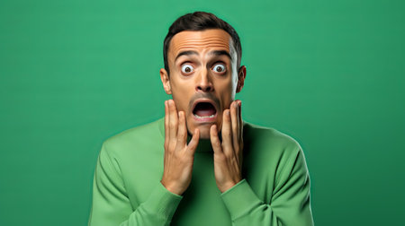 Man with shocked expression, hands on cheeks, wide eyes. open mouth. Green background. Concept of astonishment, surprise reaction, unexpected events, and unexpected news. Wide banner