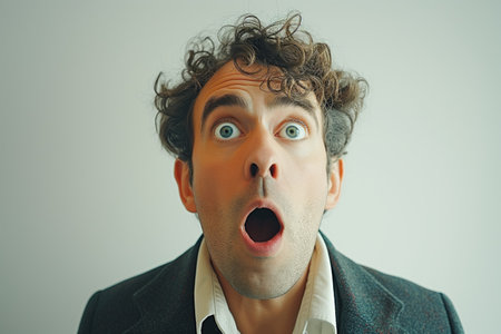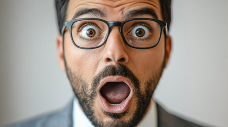 A man with a beard looks shocked his eyes wide open and mouth agape expressing astonishment in a plain light background.