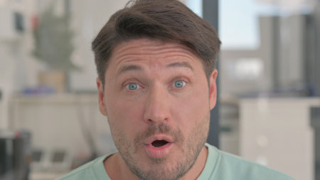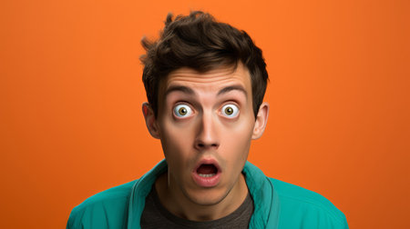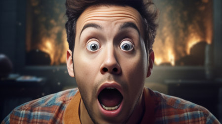 A close-up portrait of a surprised person with wide eyes and an open mouth, capturing genuine astonishment and emotion. The intense expression evokes curiosity and engagement.