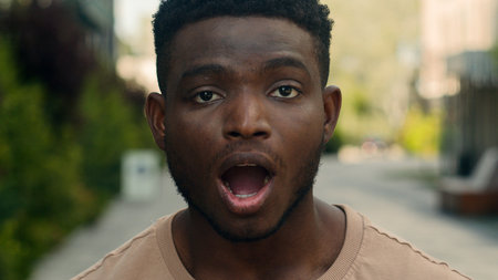 Emotional African American man amazed surprised face biracial ethnic wonder shocked stunned guy close mouth with hand feel shock wondering amazing news male surprise excited reaction outdoors in city