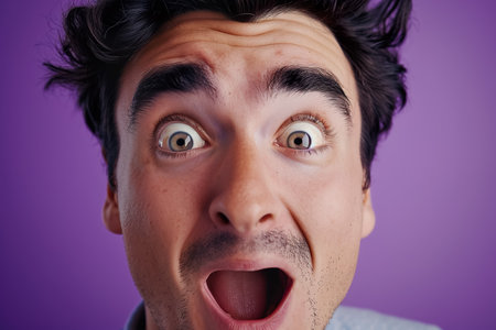 Close-up of a man with wide eyes and open mouth, expressing shock or amazement, set against a vibrant purple background.