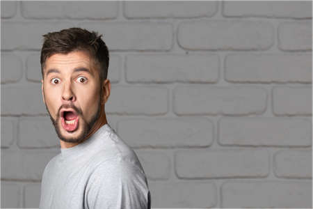 Caucasian man with short brown hair and beard wearing gray t shirt looking surprised with his mouth wide open