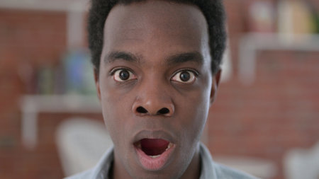 Surprised black man with an expressive face, wearing a black shirt. His wide eyes and mouth open indicate a strong reaction, showcasing curiosity and excitement.