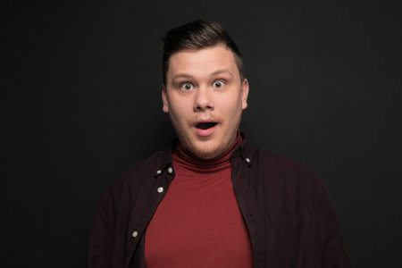 Close up portrait of young man isolated on black studio background. Photoshot of real emotions of male model. Wondering, exciting and astonished. Facial expression, human emotions concept.
