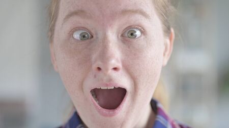 This image showcases a young woman with wide eyes and mouth opened, filled with surprise and astonishment, capturing a moment of intense emotional reaction.