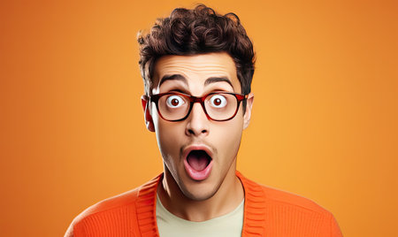 Close-up portrait of a man with a shocked expression against a yellow background. His eyes are wide, and his mouth is open in surprise.