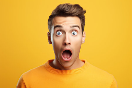 Surprised man portrait. Young guy on a simple yellow background. AI generated