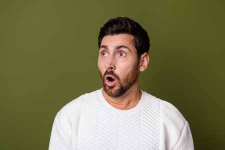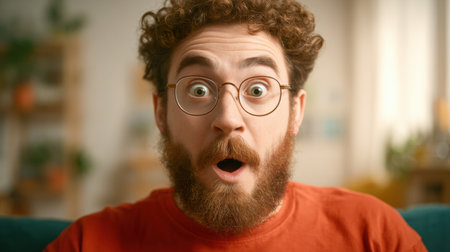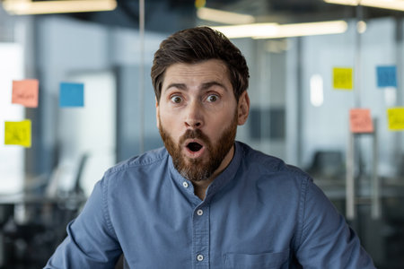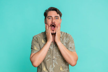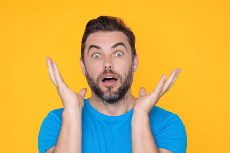 Shocked amazed beared adult guy having astonished full of disbelieve face expression.