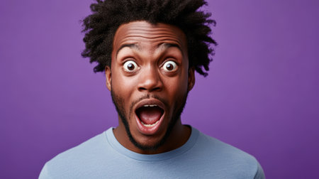 Close-up of a man with wide eyes and open mouth, expressing shock or amazement, set against a vibrant purple background.