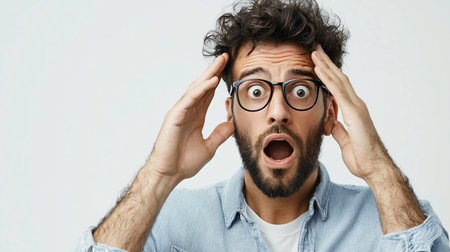 A man with curly hair and glasses expresses shock, his mouth agape and hands on his head, conveying surprise and disbelief against a clean, white background.
