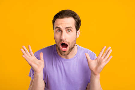 Photo of speechless shocked guy raise hands omg reaction wear purple t-shirt isolated yellow color background