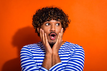 Surprised young man in striped shirt against orange background showcasing expressive emotion with casual trendy style