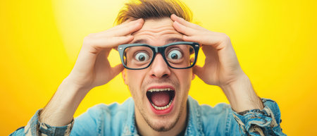A young man with glasses shows a surprised expression while holding his head. The background is bright yellow enhancing the dramatic effect.