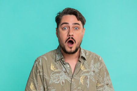 Surprise expression on a man's face against a bright turquoise background during casual indoor setting