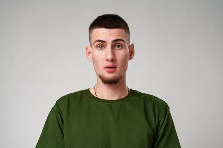 European young man is greatly surprised and opens his mouth in astonishment. studio shot