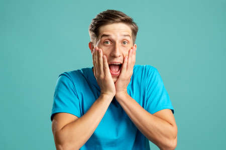 Surprised male portrait. Expressive emotion. Shaving skincare. Young positive excited man holding face looking at camera isolated on blue.