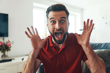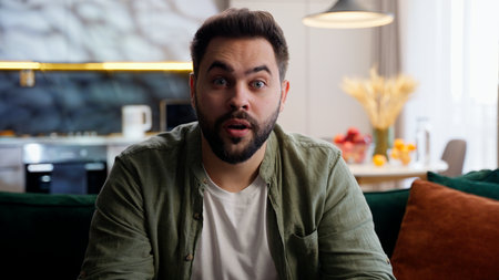 Shocked amazed excited Caucasian European model man male guy homeowner businessman customer client looking at camera gesturing shock wow open mouth wonder excitement indoor living room home apartment
