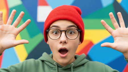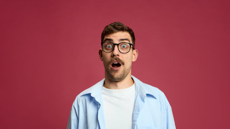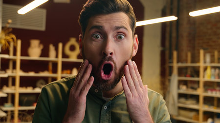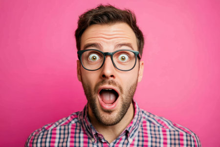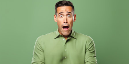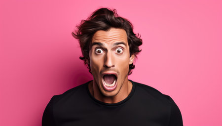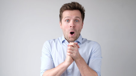 Man reacts with surprise and excitement to shocking news in a studio. Concept Excitement, Surprise, Reaction, Shocking News, Studio