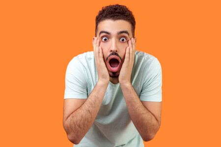 Unbelievable shocking news! Portrait of stunned brunette man with beard in casual white t-shirt holding face and keeping mouth wide open in amazement. indoor studio shot isolated on orange background