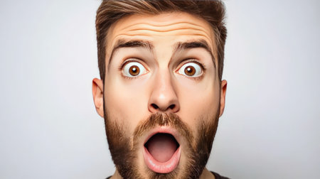 A close-up portrait of a surprised person with wide eyes and an open mouth, capturing genuine astonishment and emotion. The intense expression evokes curiosity and engagement.