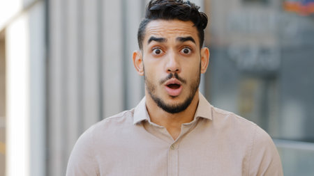 Portrait of hispanic arabian shocked bearded business man entrepreneur looking at camera opens mouth wide in surprise of unexpected news shouts. Close-up guy with expression of horror fear shock