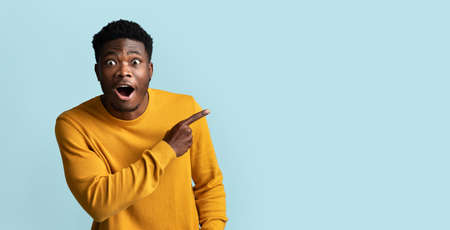 Surprised face of dark-skinned curly African-American close up in frame on yellow background. A young handsome guy opened his mouth in surprise and pulled out his eyes, pointing camera at himself
