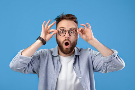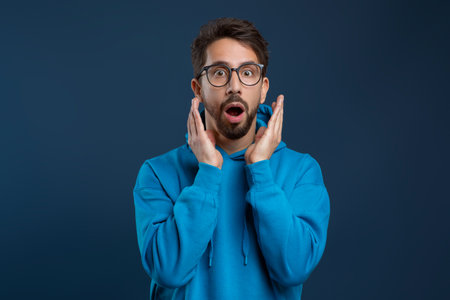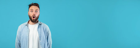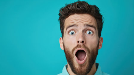 Surprised Young Man With Beard Expressing Shock Against a Bright Blue Background