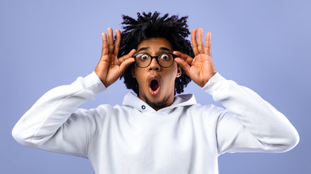 Amazed Shocked Young Black Guy Touching Glasses And Opening Mouth In Surprise