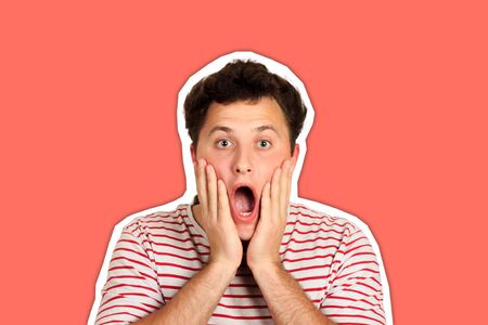Man with wow face holding hands near cheeks. Sale or discount advertising poster with a surprised man.