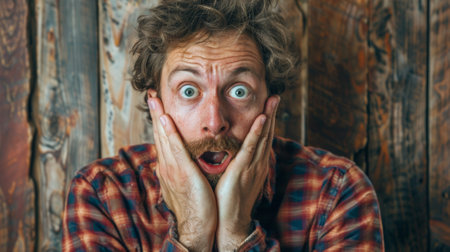 A man with a beard and plaid shirt holding his hands to his face, AI