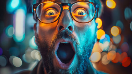 Close-up of a young man with a shocked, wide-eyed expression, illuminated by colorful lighting against a purple background.
