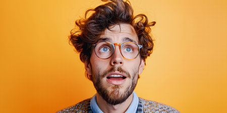 A man with glasses and a beard displays surprise as he stars at his laptop. The bright yellow background adds a lively touch to the scene, highlighting his expression.