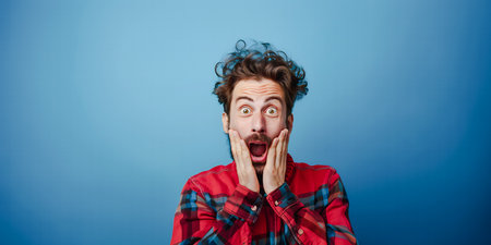 Surprised Man With Curly Hair Expressing Shock Against Blue Background