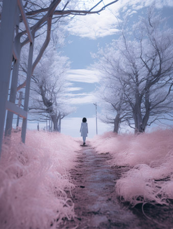 Serene Reflections: An Encountering of a Person amidst Pink Petaled Flowers -- 3:2 Aspect Ratio
