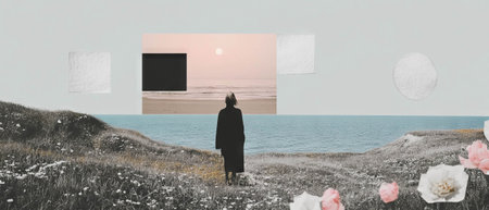 Minimalist collage depicting a tranquil sunrise over the ocean evoking inner peace and reflection