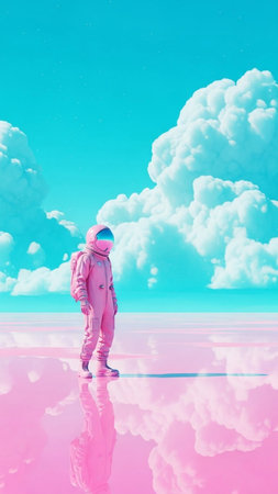 Pink Astronaut Standing on Reflective Pink Ground Under Turquoise Sky with Fluffy Clouds, Surreal Dreamlike Landscape Digital Art