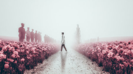 Colorful poppy flowers bloom in a dreamy landscape as silhouettes of people stroll through the field during misty dawn hours, creating a serene atmosphere.